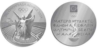 Quod autem attinet ad numismata, pulchris delineamentis et litteris Graecis ornata sunt, atque inscriptione quadam prisca lingua Hellenica facta, ut e.g. inspicere possumus in hoc numismate argenteo quod merita est athletissa Britanna, Catherina Bishop, -quae est filia Latinitatis studiosi, Brenni Bishop, sodalis fori electronici q.i. Grex Latine loquentium- in certamine finali artis remigandi in cumba duarum remigum. Inscriptio in prisca lingua Hellenica facta videtur esse excerptum carminis cujusdam Pindari, quod, Brenno Bishop rogante, in Latinum vertit alius sodalis Gregis Latine loquentium, nomine Lucius Alter. Deinceps igitur vobis describo inscriptionem Graecam antiquam versuum Pindari, quae apparet in numismate, et interpretationem cum versione Latina a Lucio propositam: